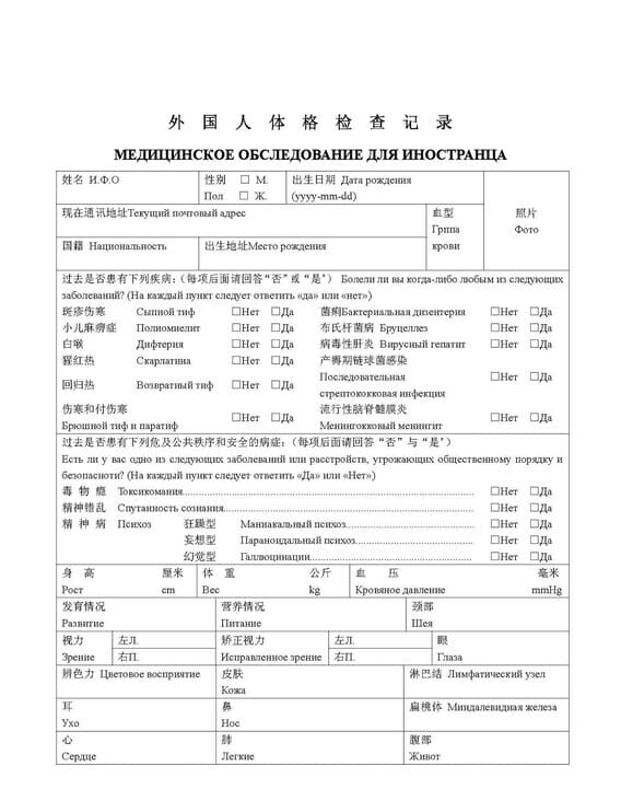 Есть две версии документа – на русском, английском языках. Оба варианта предполагают повтор информации на китайском языке. Прилагают к документу снимок грудной клетки, ЭКГ, анализ крови. Пройти обследования допускается в любом сертифицированном медицинском учреждении, где выдают медицинские формы для поездок, обучения за границей.