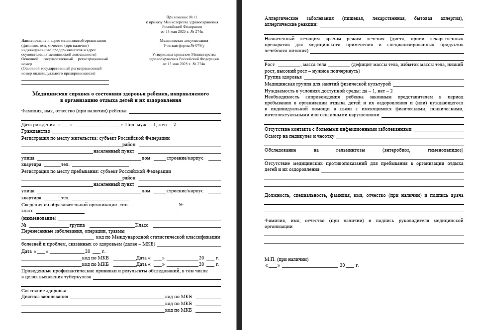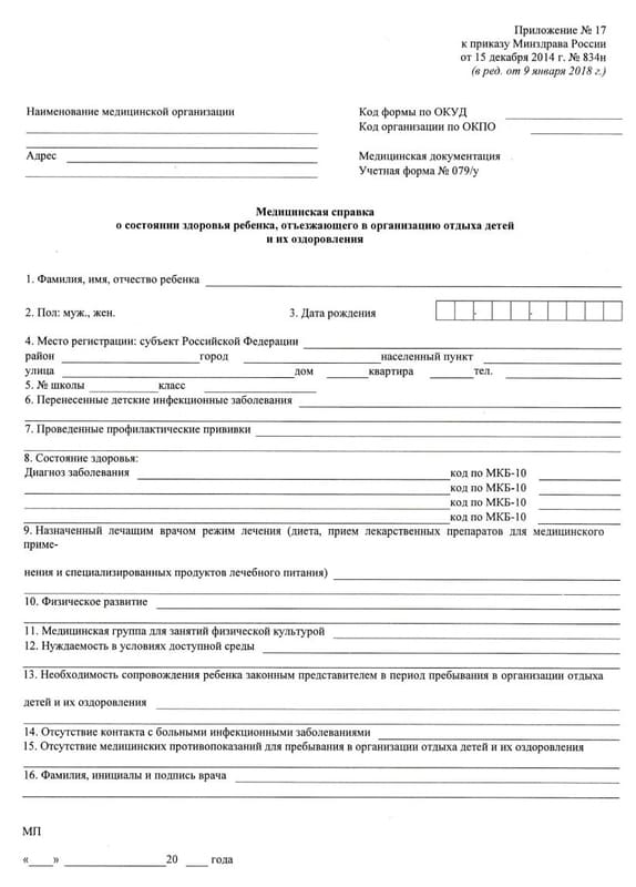 Детские лагеря, санатории среди требований к отдыхающим предъявляют наличие справки по форме 079 у. Чтобы смена прошла спокойно, дети должны быть здоровыми. Справки подтверждают, что осмотр пройден, серьезных патологий не обнаружено. Конечно, это не дает 100% защиты от рисков, но заметно снижает их.